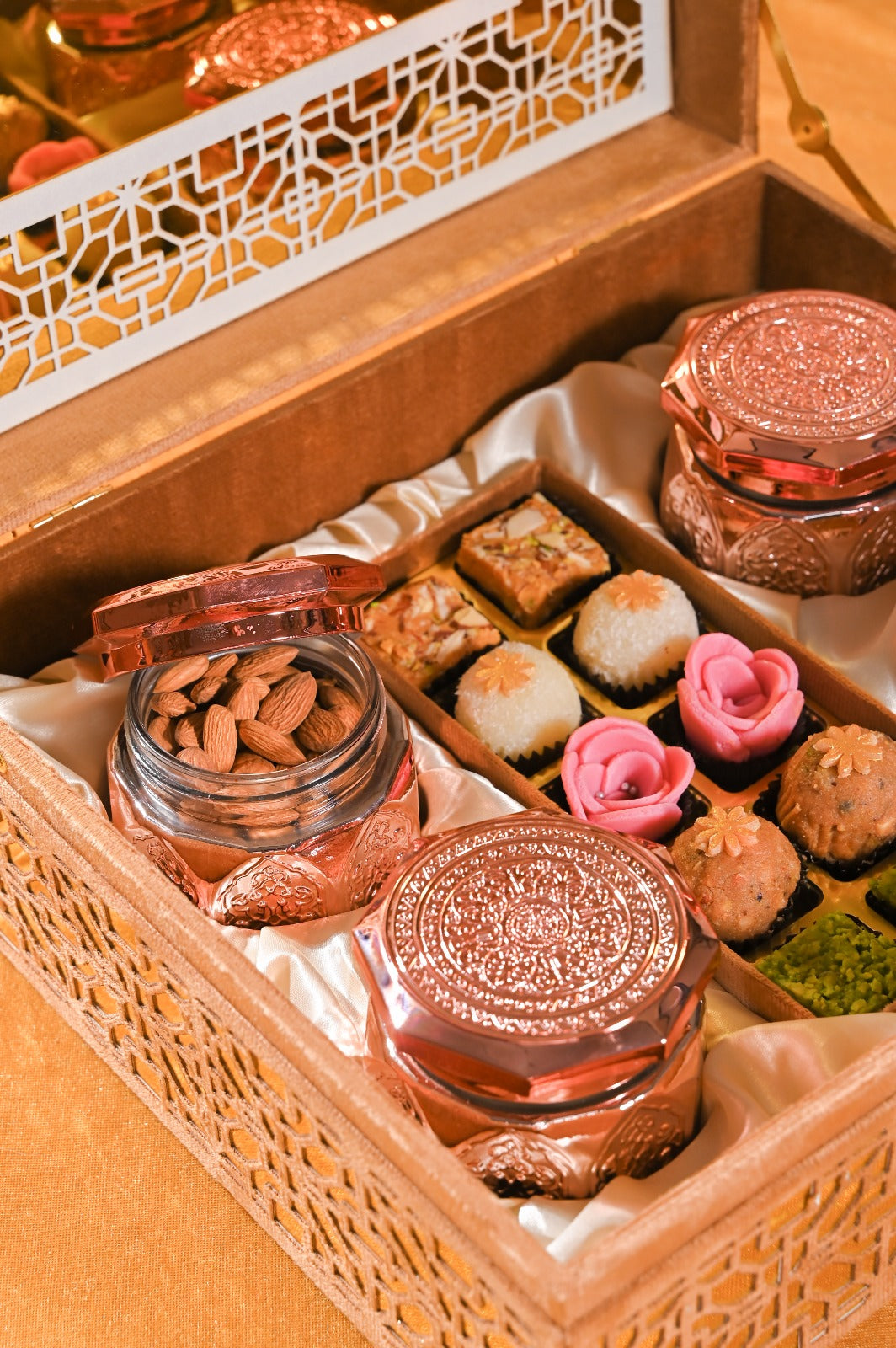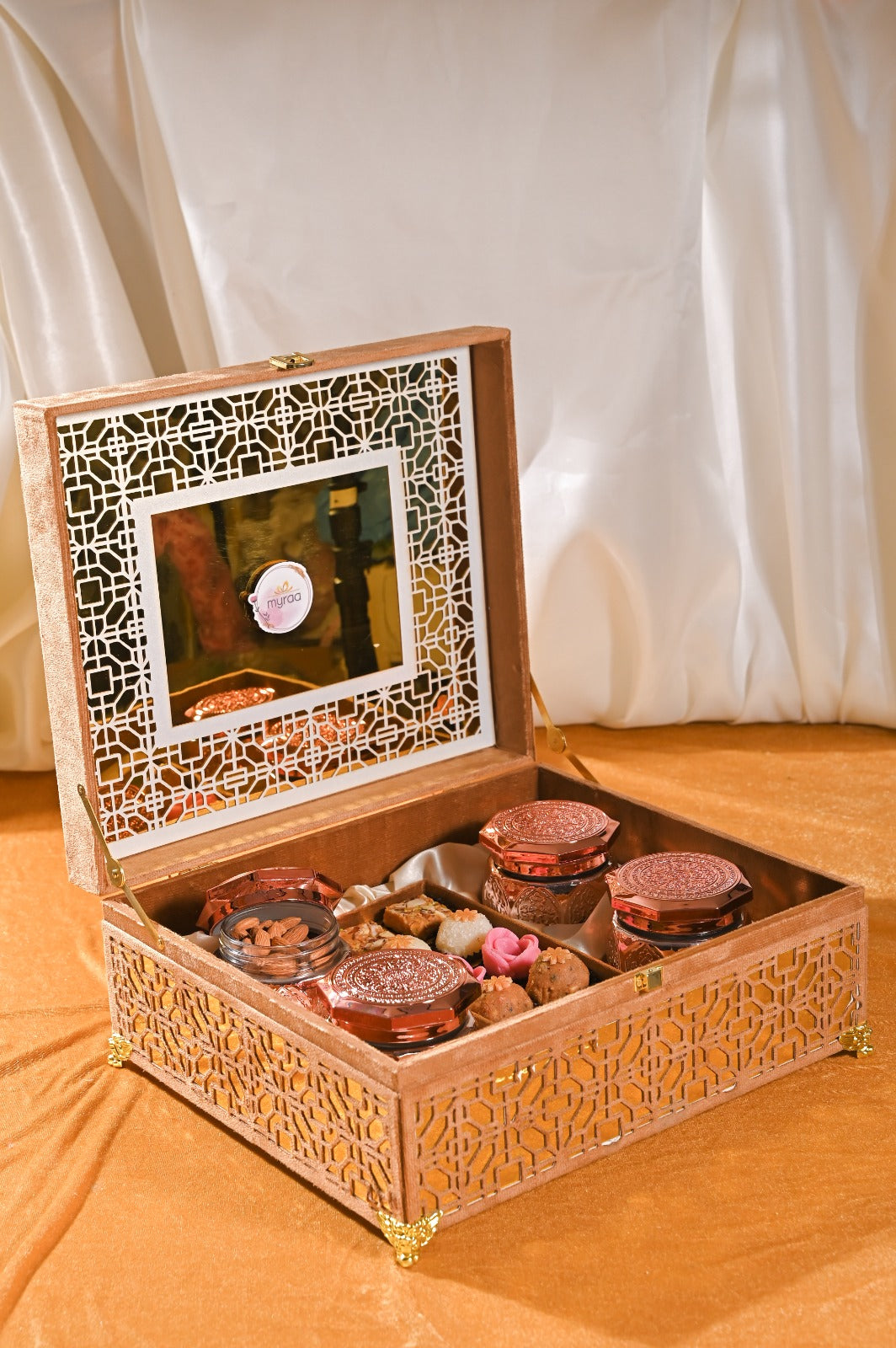 This is a luxurious, velvet-textured gift box that exudes elegance and opulence—perfect for premium festive, wedding, or corporate gifting.