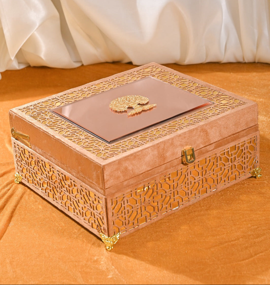 The box is wrapped in a plush velvet fabric with a rich golden-peach hue, giving it a soft, royal appearance. The top lid is adorned with a glossy rectangular panel in a matching peach tone, featuring a golden metallic Tree of Life emblem at its center. Surrounding this panel is a beautifully laser-cut lattice design, also echoed on the sides of the box, enhancing its intricacy and grandeur.